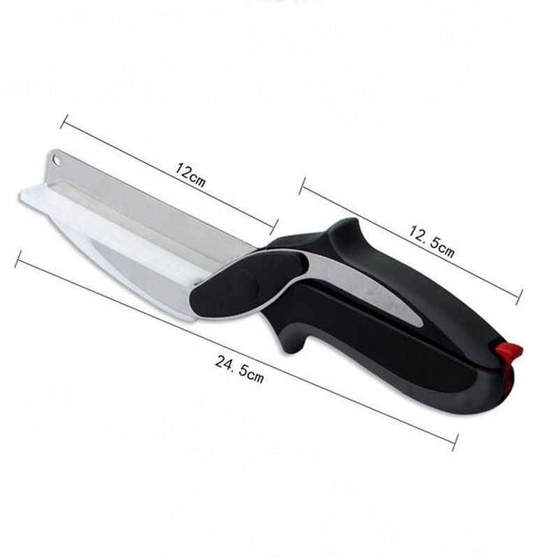 The 2-in-1 knife and cutting board chopper scissors allows you to easily cut up meat, cheese, bread, fruit, vegetables, potatoes, and pretty much anything else you could think of. Plus with the quick scissor-like action works about 10x faster than cutting things up with a knife.