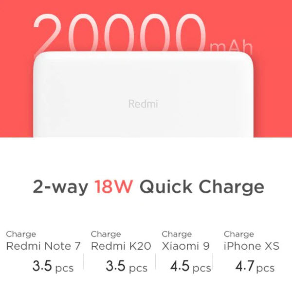 The Mi Redmi 20000mAh Power Bank comes with the large capacity 20,000mAh Battery that can easily charge multiple devices at one complete recharge.