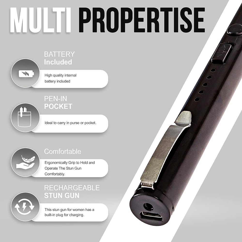 POWERFUL SELF-DEFENSE: Just test-firing the shock pen into the air is often enough to stop an attacker. ENSURE SAFETY AT UNCERTAIN TIMES! FEATURES A MUST-HAVE POWERFUL SELF DEFENSE EASY TO CONCEAL  RECHARGEABLE STUN