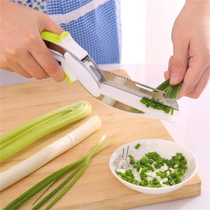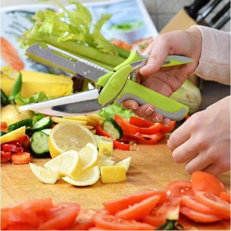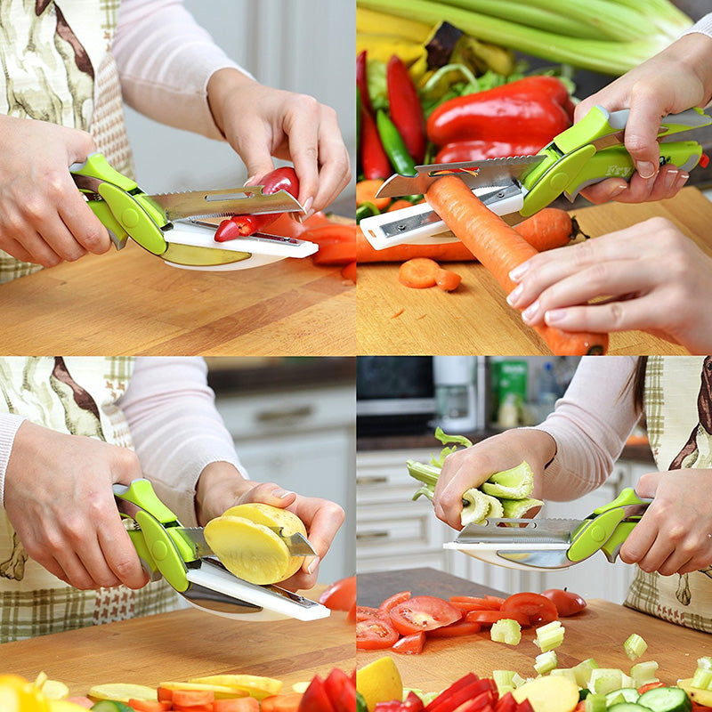 Combines functions of scissors, a cutter, chopper, dicer, carver, slicer, cutting board and even opener. Silicone surface of the handles and rust-resistant steel blades. Embedded latch is to provide safe dishwashing and exclude accidental cuts. Small, portable and multifunctionality.